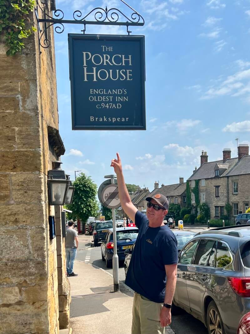 We spent the afternoon in Stow-on-the-Wold. It was Steve's favorite stop so far--a market town full of really "old shit." We had lunch at the Porch House, the oldest pub in England, 947 AD. Lots of minding our heads in there! We wandered around the buildings and into St Edward's Church. The back door of the church is framed by enormous yew trees and was Tolkien's inspiration for the Doors of Durin. It is magical.