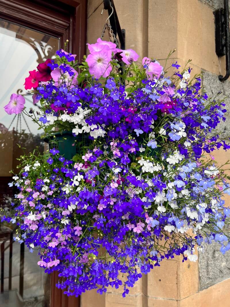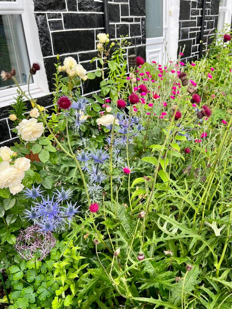We first stopped off in the village of Kyle of Lachalsh, just over the bridge from Skye, in search of lunch. I found a couple of cafes with recent great reviews, so we followed GPS and ended up at the base of apartment stairs behind a building... Then we searched for the other one and the address did not exist. We wandered on down the street and found a diner called Hector's Bothy. The menu looked promising so we ordered panini sandwiches; Steve got ham and tomato, and I chose cheddar with pickle. We received toasted hotdog buns with a tiny bit of filling. Unsatisfied, we popped into Beth's deli where Steve saw some treats--there were a few though the meats and cheeses were all wrapped up. We stood at the counter while Beth worked on on some paperwork with a construction worker. Eventually she said, "you alright then?" We took that as our cue to order a couple of shortbread bars. Not sure when they were made, but not recently. If you ever get to this little village, bring a sandwich. Though I did see a lovely garden.