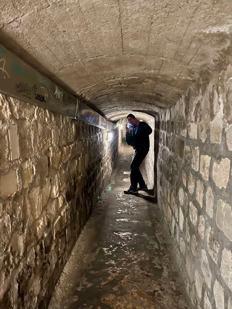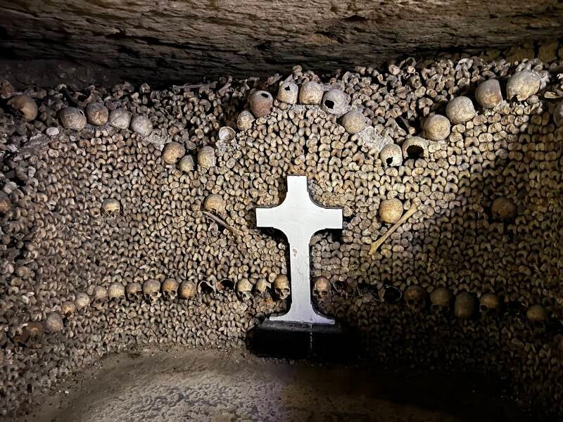 We visited the Catacombs of Paris next. Early Left Bank Paris architecture was constructed of limestone sourced from under ground, which was great for a couple of centuries until the underground mining began to cause streets to collapse in the 18th century. A concurrent sanitation problem from overflowing cemeteries required the removal of bones of millions of Parisians, and they were transferred to the abandoned quarries beginning in 1788 with covered wagons transporting remains in the dark of night. The underground ossuaries now house remains from both notable names and common folks. Sections are marked by the cemeteries they came from, but otherwise they are unidentified. It's every bit as dark and eerie as you might imagine, though fascinating as well.