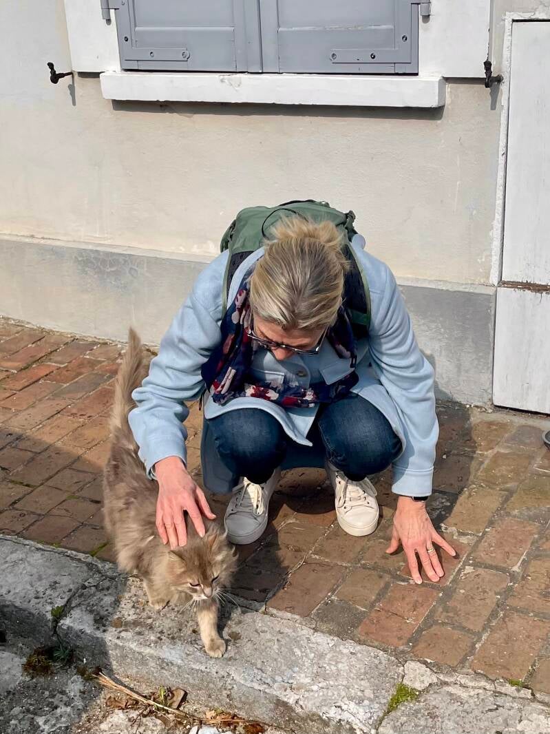 After a day in the Middle Ages, we descended the hill in search of food and transportation back to the city. But first--more kitties! Les chats sont amiceaux!