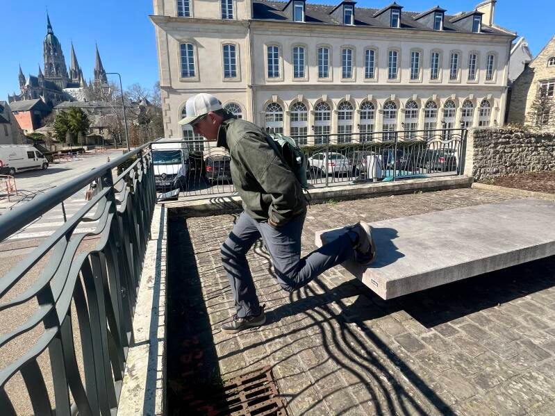 We had a short walk to our tour meeting spot. The first thing I saw in Bayeux was la poste--on a bicycle! Now why hasn't someone in Portland thought of this? I next spotted cathedral spires and learned later that it's a 12-century cathedral. Sadly, we didn't have time to visit it. But Steve did have time to limber up.