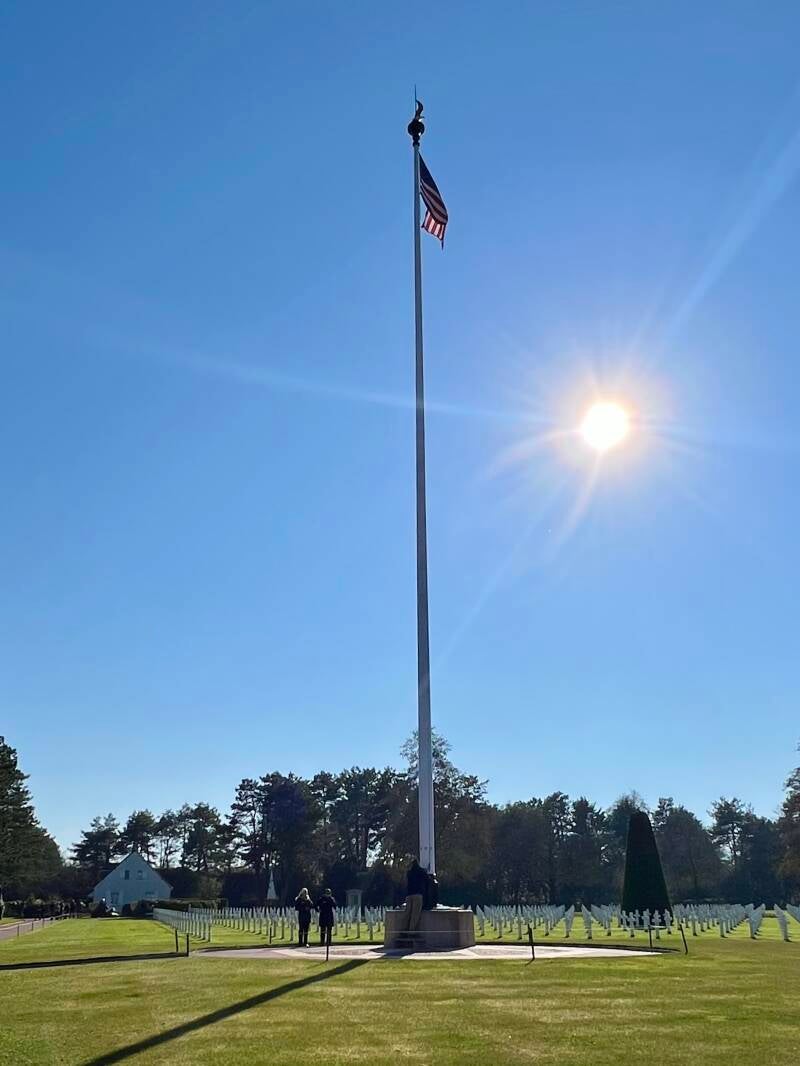 We traveled next to the Normandy American Cemetery and Memorial (Cimetière Américain de Normandie), arriving in time for the lowering of the flags and Taps. Chills.