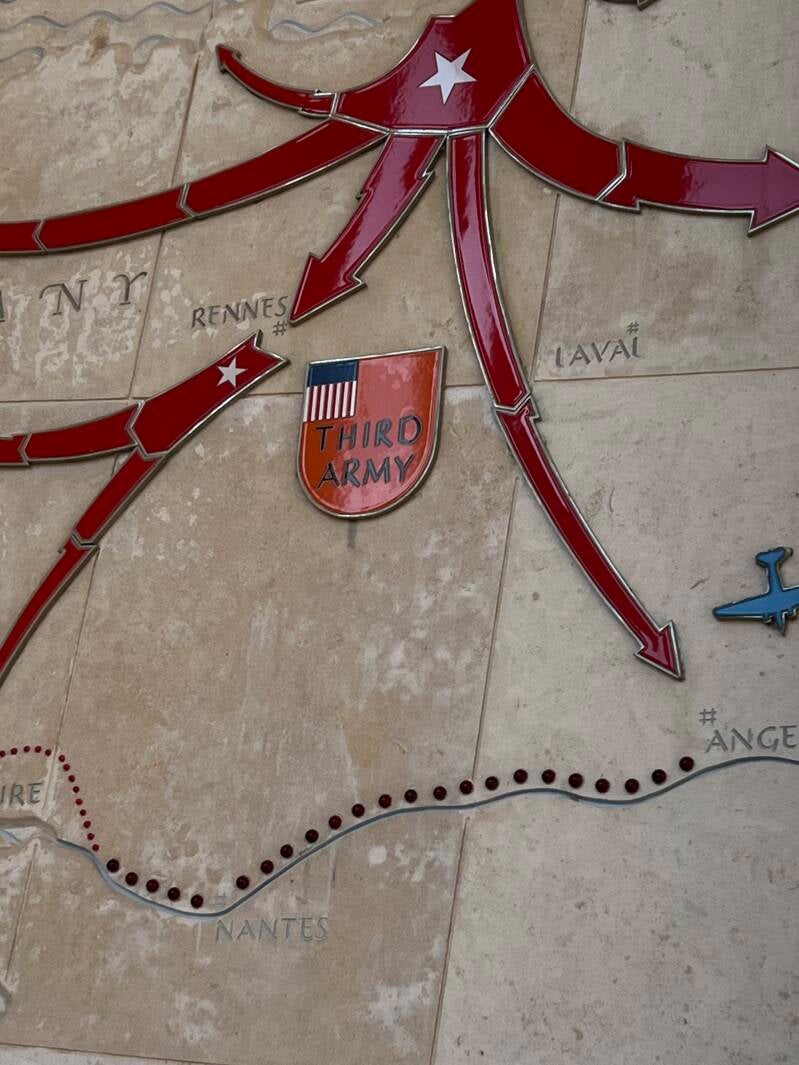 My step-grandfather, Judy's dad, W.D. Johnson, arrived at Omaha Beach three days after D-Day. We found the plan and his unit, Third Army, and saw the advance and his landing.