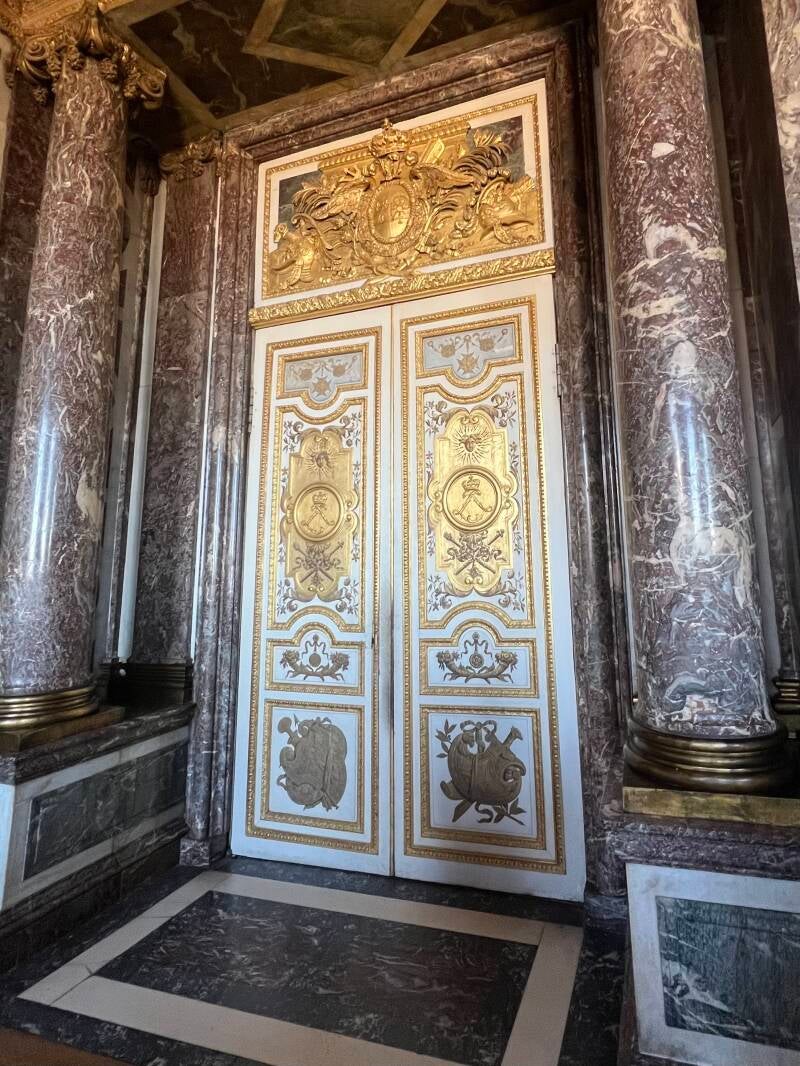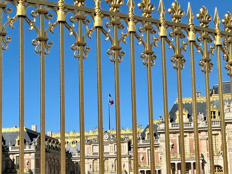 Versailles was originally a hunting lodge under the reign of Louis VIII; the current palace was built up all around it, but the original structure can still be seen directly under the French flag.
