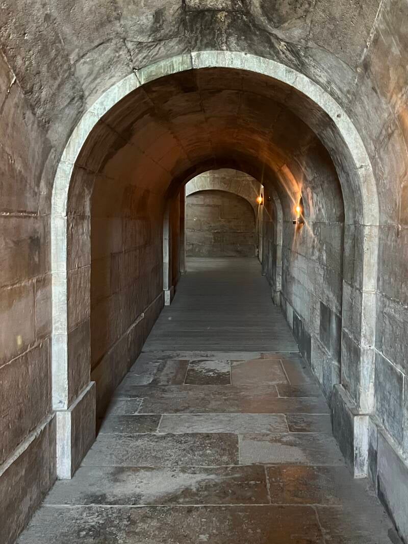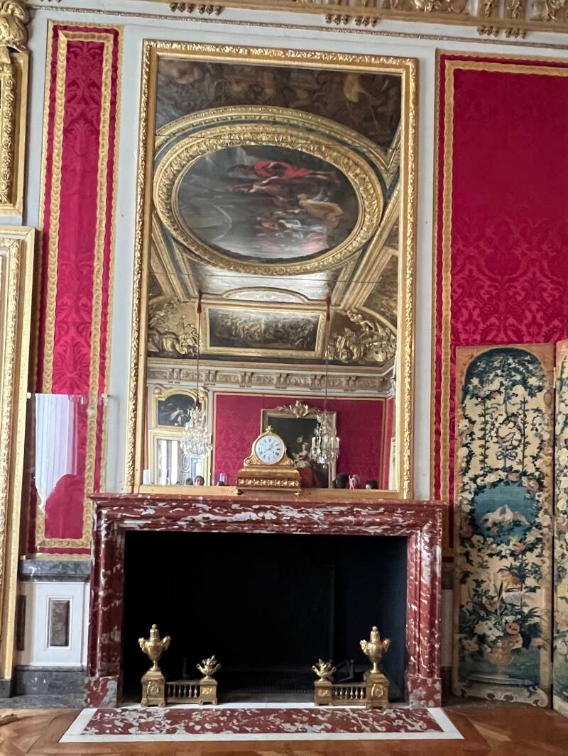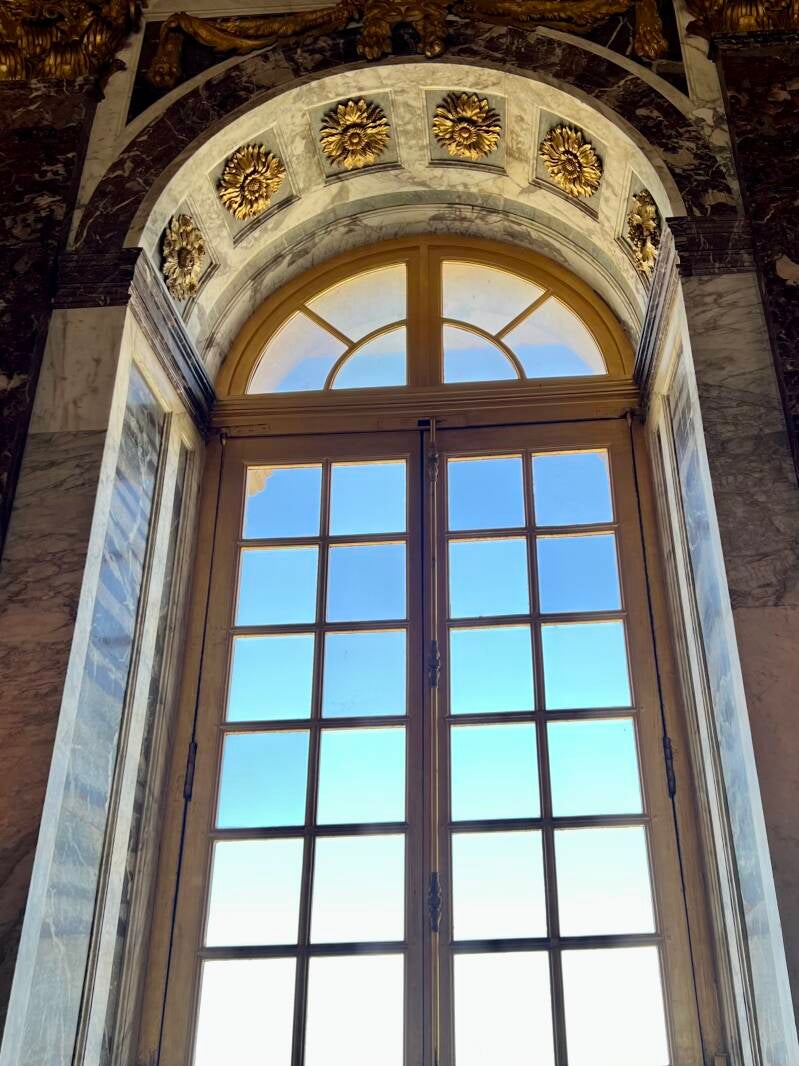 The famous Hall of Mirrors was designed for King Louis XIV to receive nobility, and it was intended to show his wealth and power. Visitors would enter and proceed down to greet the king. It is a long room with hinged mirrors along one wall and a wall of windows facing west along the other. This allowed for sunlight to stream in, and the mirrors could be angled to shine on Louis in his throne. The paintings on the ceiling and above the mirrors tell the story of Louis XIV's success, at least according to him.
